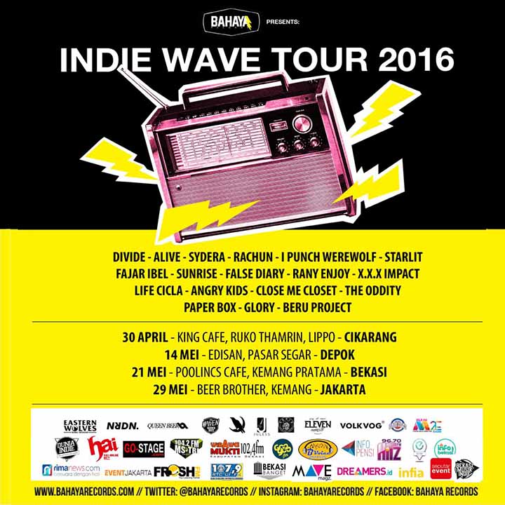 GO-STAGE.com – BAHAYA RECORDS bekerjasama dengan M2E Radio menggelar rangkaian tour musik yang bertajuk “INDIE WAVE TOUR 2016” dengan tema #anakmudapositif.
