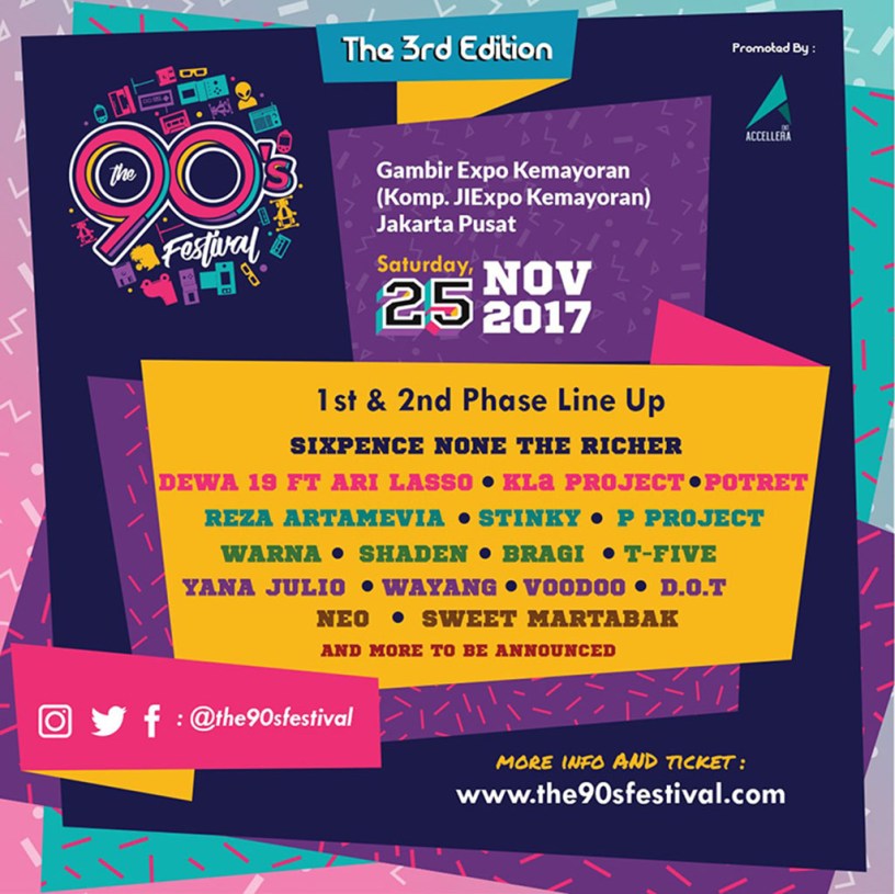 Setelah sebelumnya diumumkan line up phase pertama dari gelaran event The 90s Festival , kali ini pihak penyelenggara mengumumkan phase line up kedua. Pada line up tahap pertama dari group band yang akan tampil pada penyelenggaraan The 90’s Festival tahun ketiga ini, terdapat 8 gorup atau musisi lokal yang sudah confirm dan satu musisi internasional.