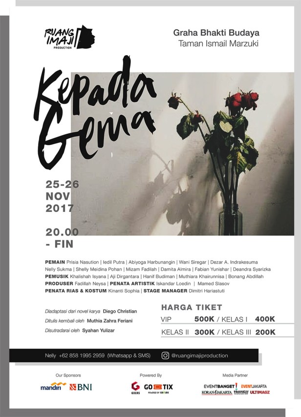 GO-STAGE.com – Ruang Imaji Production akan kembali menyelenggarakan pementasan ketiga bertajuk “Kepada Gema”. Pementasan ini akan digelar selama 2 hari, yaitu tanggal 25 & 26 November 2017, di Graha Bhakti Budaya, Taman Ismail Marzuki.