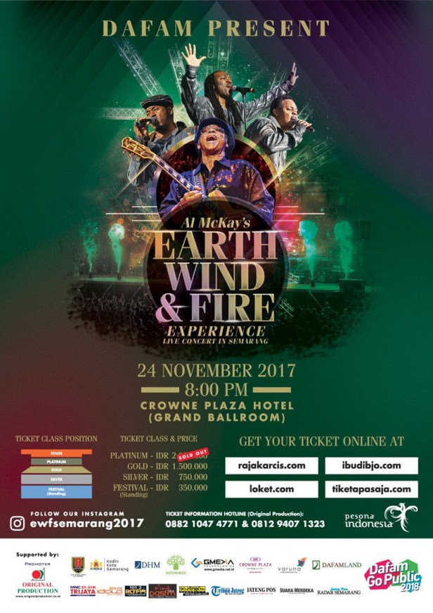 GO-STAGE.com – Group band jazz tersohor asal Amerika Serikat “Earth Wind & Fire (EWF)” akan menggelar konser di Semarang.Jawa Tengah pada 24 November 2017 mendatang.