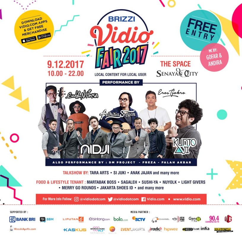 Acara BRIZZI Vidio Fair 2017 akan diramaikan oleh community meet up, talkshow dari content creator’s dan juga penampilan musisi kenamaan Indonesia yang paling ditunggu yaitu Eros Tjokro, Adhitya Sofyan, Kunto Aji, Endah n’ Rhesa dan Nidji.