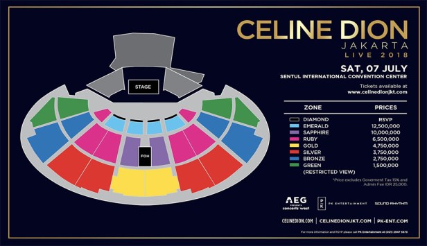 Tiket konser Celine Dion Live 2018 dapat diperoleh melalui www.celinedionjkt.com dengan harga sebagai berikut: