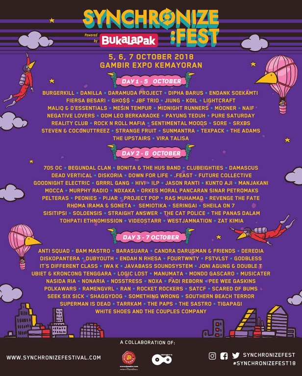 GO-STAGE.com – Perhelatan Synchronize Fest 2018 sudah semakin dekat. Daftar penampil fase keempat resmi diumumkan oleh Demajors dan Dyandra Promosindo di Quibcle Center, Jakarta pada Rabu (15/8) kemarin. Mereka membeberkan 37 musisi untuk melengkapi total 114 penampil yang siap meramaikan edisi ketiga dari Synchronize Fest.
