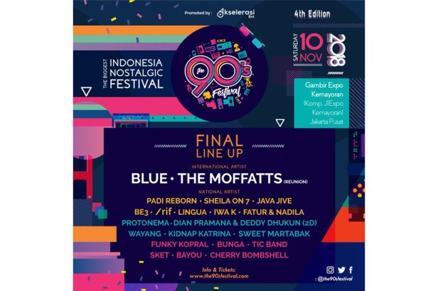 The 90’s Festival akan membawa pengunjung kembali bernostalgia dengan sederet artis dan musisi papan atas di Era 90-an. Diantaranya : BLUE, The Moffatts Reunion, Padi Reborn, Sheila On 7, Java Jive, Lingua, Be3, Bunga, Kidnap Katrina, Iwa K, Sweet Martabak, Protonema, Funky Kopral, /rif, Fatur & Nadila, Dian Pramana & Deddy Dhukun (2D), Wayang, Tic Band, Sket, Bayou dan Cherry Bombshell akan mengisi The 90’s Festival 2018.