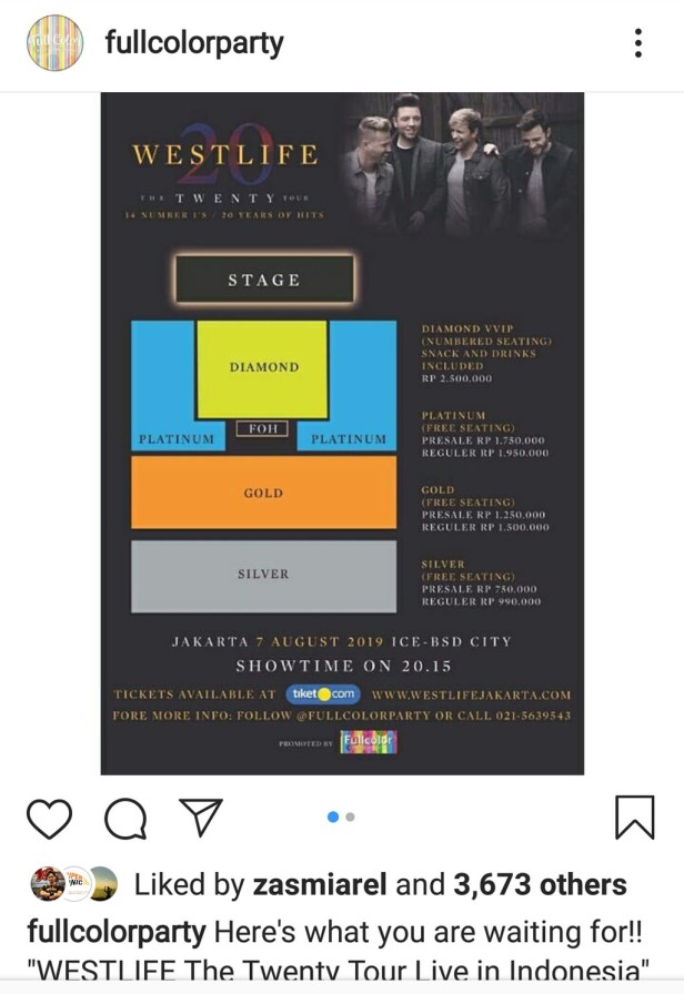 GO-STAGE.com – Full Color Entertainment hari ini resmi mengumumkan bahwa tiket konser Westlife The Twenty Tour 2019 di Indonesia sudah habis terjual (Sold Out) hanya dalam 2 jam sejak pertama kali di buka pukul 11.59 wib pada hari Kamis, 28 Maret 2019. Westlife akan bertandang ke Indonesia pada bulan Agustus mendatang.