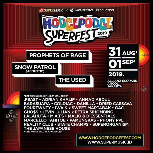 GO-STAGE.com – Hodgepodge Superfest 2019 yang akan diselenggarakan pada tanggal 31 Agustus – 1 September 2019 adalah festival musik terbaru dengan beragam genre musik yang dipersembahkan oleh Java Festival Production dan bekerja sama dengan Supermusic.