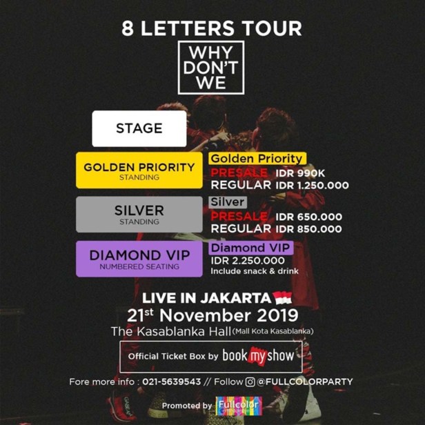 Tiket konser Why Don’t We – 8 Letters Tour Live in Jakarta tersedia dalam beberapa kategori kelas yang akan dijual secara online melalui official tiket box resmi mulai hari Sabtu, 27 Juli 2019 jam 11.59 WIB di https://id.bookmyshow.com/jakarta dan http://www.fullcolor-entertainment.com serta secara offline di kantor Full Color Entertainment di Mall Taman Anggrek P2 No.19, dengan harga tiket sebagai berikut: