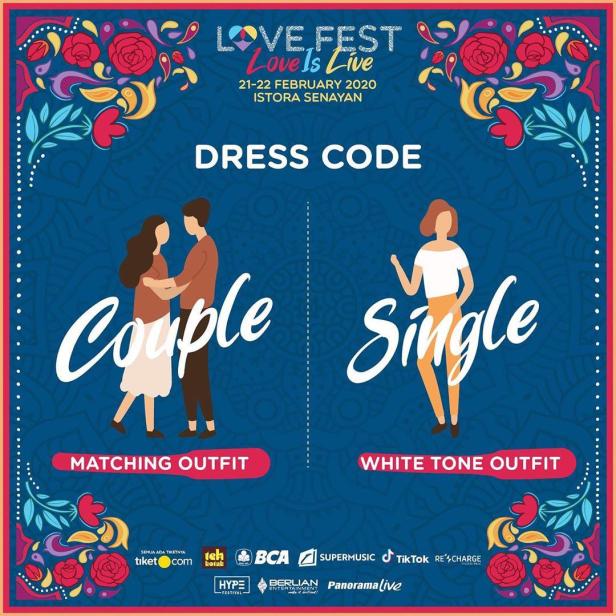 Informasi yang perlu diketahui Dress Code untuk datang ke LOVE FEST 2020 – Love is Live dengan menggunakan Matching Outfit untuk Couple atau yang sudah punya pasangan atau datang bareng pacar dan White Tone Oufit bagi yang masih lajang atau Single.