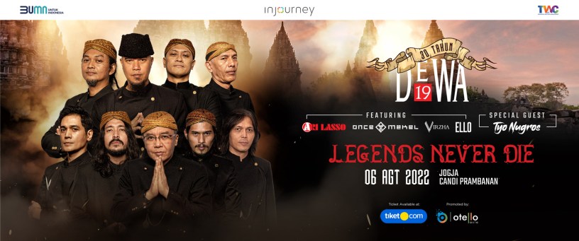 GO-STAGE.com – Otello Asia bersama Injourney dengan bangga akan menghadirkan “Pertama dalam sejarah DEWA 19 Full Team dengan 4 Vokalis dan 2 Drummer” untuk konser 30 Tahun Dewa 19 di Yogyakarta dengan tema “Legends Never Die” di Candi Prambanan – Yogyakarta pada Sabtu, 06 Agustus 2022.