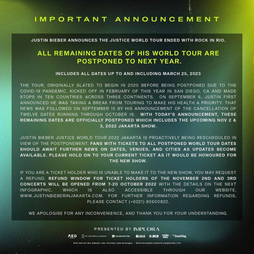 Penetapan jadwal baru terus dilakukan secara proaktif sehubungan dengan penundaan konser Justin Bieber Justice World Tour 2022 Jakarta. AEG Presents Asia, PK Entertainment dan Sound Rhythm selaku penyelenggara konser Justin Bieber di Indonesia akan membuka opsi pengembalian dana (refund) untuk pemegang tiket yang tidak dapat hadir ke konser di tahun depan. Pengajuan pengembalian dana dapat dilakukan antara 7-20 Oktober 2022 melalui situs resmi www.justinbieberinjakarta.com.