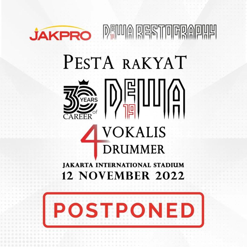 GO-STAGE – JAKPRO dan DEWA RESTOGRAPHY hari ini resmi mengumumkan “PESTA RAKYAT 30 Tahun Berkarya DEWA 19” yang seharusnya akan dilaksanakan pada Sabtu, 12 November 2022 di lokasi terbaru stadion kebanggaan tanah air, Jakarta International Stadium (JIS) resmi ditunda ke tahun depan Sabtu, 4 Februari 2023.