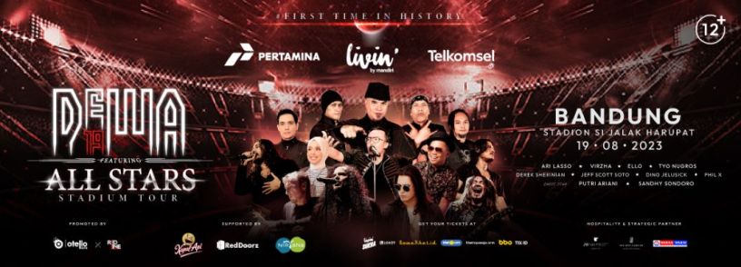 DEWA 19 featuring ALL STARS STADIUM TOUR 2023 merupakan konser kolaborasi pertama terbesar dalam sejarah DEWA 19 di Indonesia dan menjadi sejarah baru konser berskala Stadium Show bersama musisi legendaris Internasional ternama dunia “ALL STARS” tampil dalam satu panggung. Pertamina, Livin’ by Mandiri, Telkomsel – DEWA 19 featuring ALL STARS STADIUM TOUR 2023 – Sabtu 19 Agustus 2023 di Stadion Si Jalak Harupat turut didukung oleh Kapal Api, dan RedDoorz dan Nirvana Mineral Water serta Hospitality Partners: JW Marriott Hotel Jakarta, The Ritz-Carlton Jakarta Mega Kuningan dan Warna Warni.