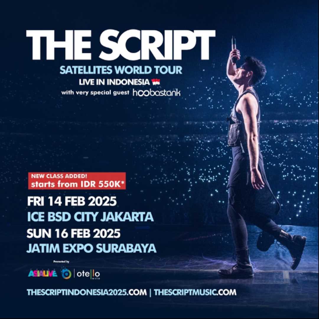Dalam konser spektakuler ini, The Script juga akan membawakan lagu-lagu terbaru dari album “Satellites”, yang diyakini akan menciptakan momen emosional dan inspiratif bagi para penggemar. Tak hanya itu, grup rock asal Amerika, Hoobastank, akan turut memanaskan panggung lewat karya-karya andalannya seperti “The Reason,” “Crawling in the Dark,” dan “Running Away.”