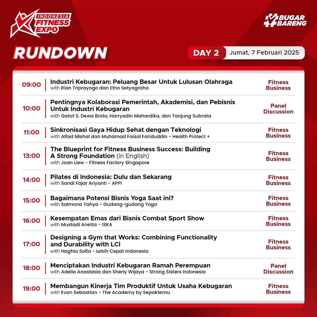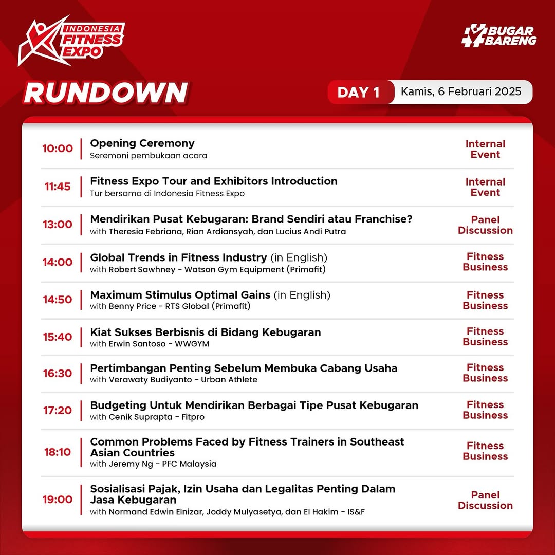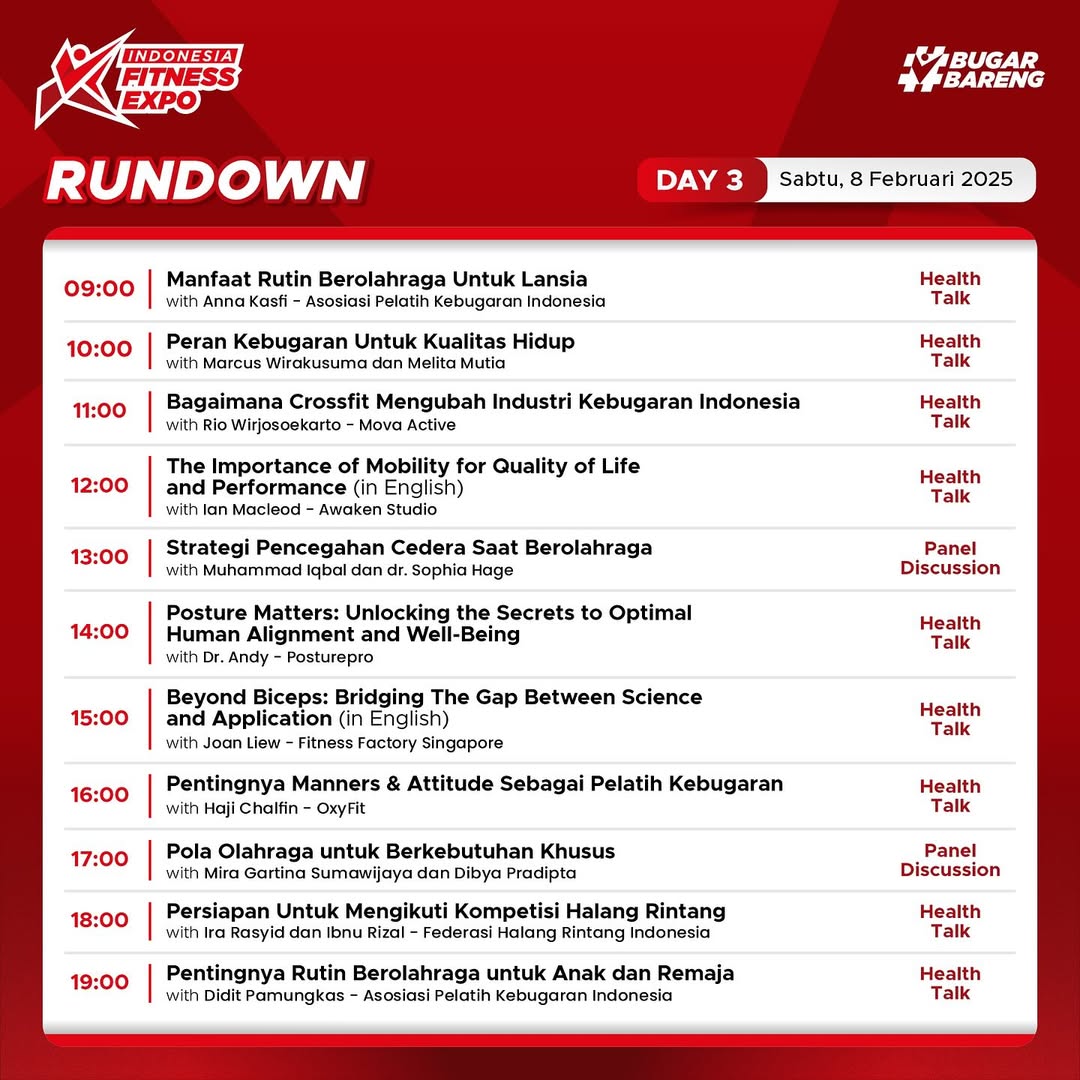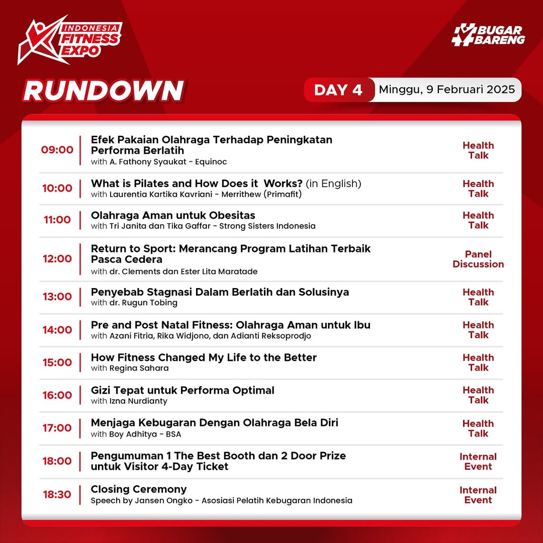 Indonesia Fitness Expo 2025 akan diselenggarakan selama 4 (empat) hari dengan menyajikan berbagai macam kegiatan yang tentunya sangat bermanfaat bagi semua kalangan pegiat gaya hidup sehat. Selama empat hari penuh, rincian kegiatan yang akan dilaksanakan di pameran ini adalah sebagai berikut.