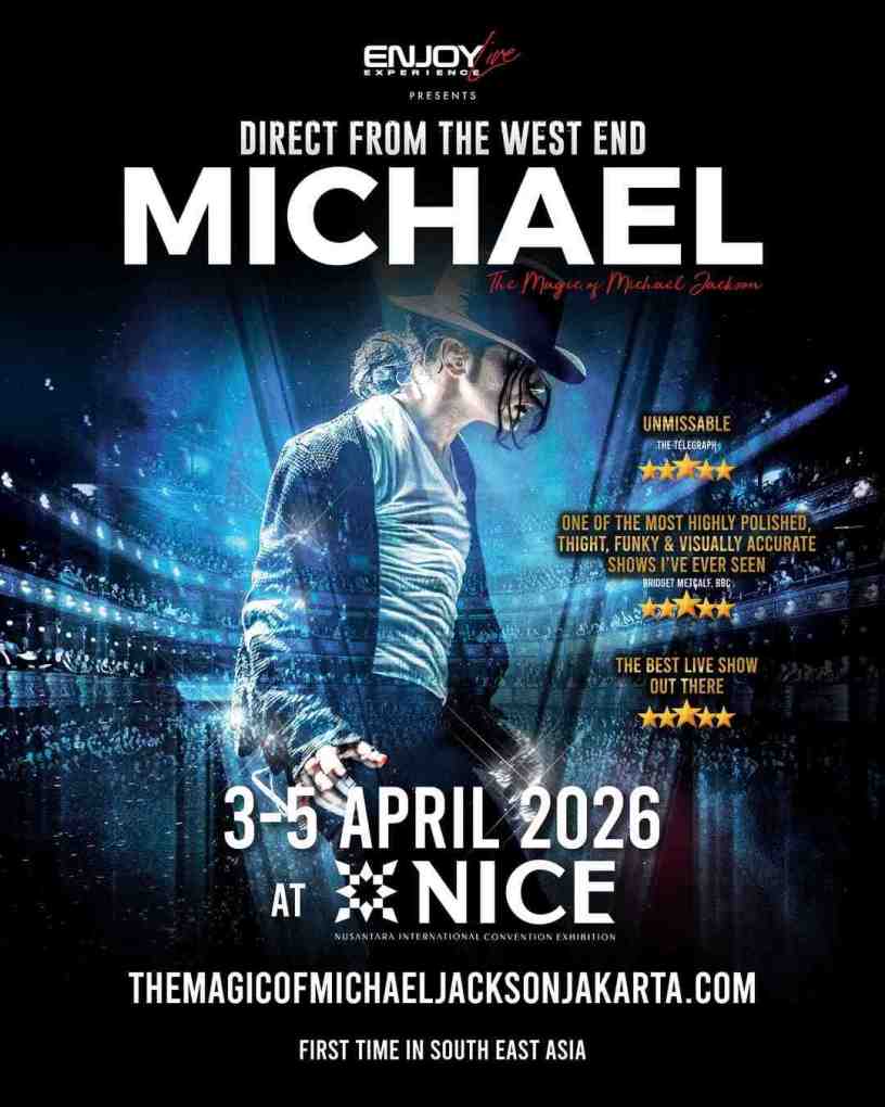 GO-STAGE.com – Enjoy Live Experience dengan bangga menghadirkan langsung sensasi dari West End Inggris bertajuk “Michael – The Magic of Michael Jackson” ke Jakarta untuk pertama kalinya di Asia Tenggara. Menampilkan Ben Bowman, seniman tribute Michael Jackson terkemuka dari Inggris, dalam produksi panggung ternama Michael® Starring Ben, pertunjukan spektakuler ini akan berlangsung di Nusantara International Convention Exhibition (NICE), PIK 2 selama lima kali pertunjukan pada 3–5 April 2026.