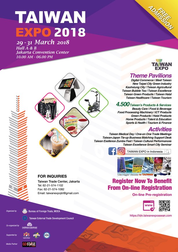 TAIWAN EXPO 2018, organized by Bureau of Foreign Trade, Ministry of Economic Affairs (MOEA) of Taiwan, implemented by Taiwan External TradeDevelopment Council (TAITRA), Hall A & B, Jakarta Convention Center (JCC), Senayan, Jakarta, Indonesia, 29-31 March 2018