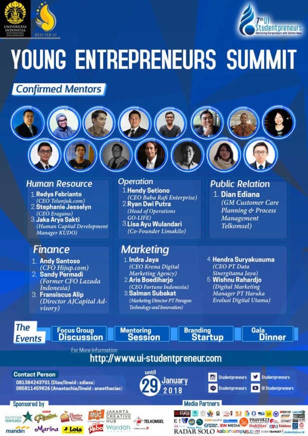 YOUNG ENTREPRENEURS SUMMIT, digelar oleh Badan Eksekutif Mahasiswa (BEM), Fakultas Ekonomi dan Bisnis, Universitas Indonesia (FEB-UI), bertempat di Auditorium Soeria Atmadja, Fakultas Ekonomi dan Bisnis, Universitas Indonesia, Depok, 17 Februari 2018
