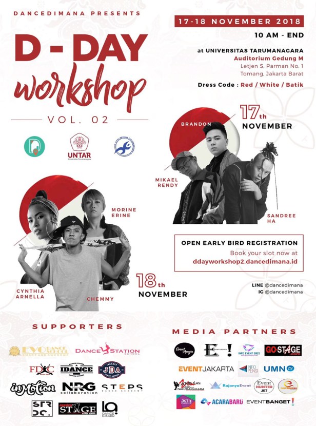 D-DAY WORKSHOP 2018 diselenggarakan oleh Dancedimana Universitas Tarumanagara, bertempat di Auditorium Gedung M Universitas Tarumanagara, Tomang, Jakarta, Indonesia, 17 – 18 November 2018.