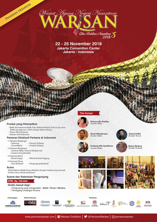 Pameran Wasiat Agung Negeri Nusantara (WARISAN) 2018 diselenggarakan oleh PT. Mediatama Binakreasi, bertempat di Jakarta Convention Center (JCC), Senayan, Jakarta, Indonesia, 22-25 November 2018.