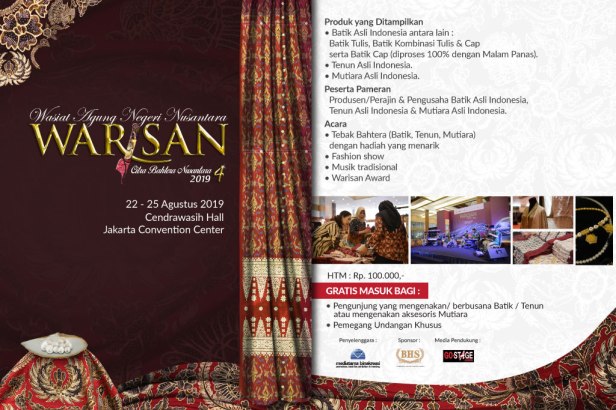 Pameran Wasiat Agung Negeri Nusantara (WARISAN) 2019 diselenggarakan oleh PT. Mediatama Binakreasi, bertempat di Jakarta Convention Center (JCC), Senayan, Jakarta, Indonesia, 22-25 Agustus 2019.